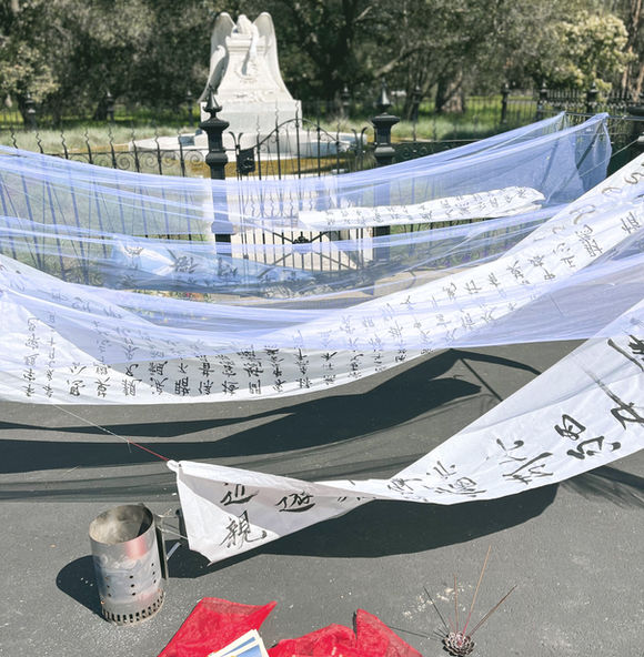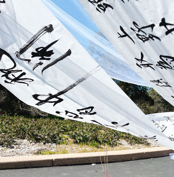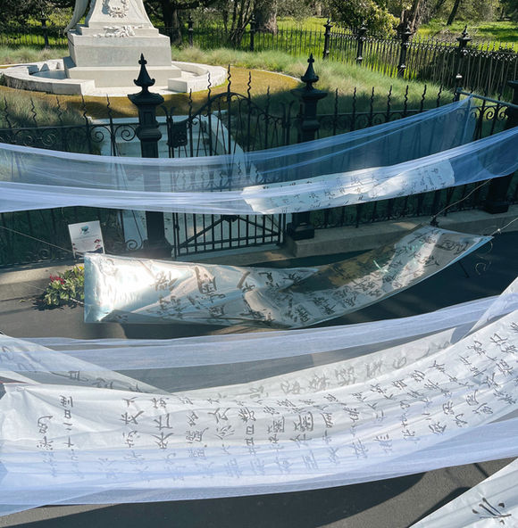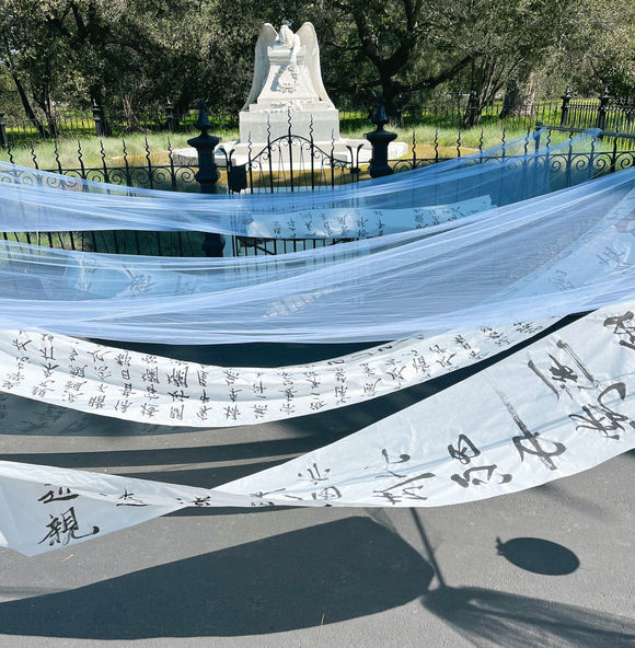 Diasporic Tombsweeping is an installation that excavates tethered histories of migration in Chinese America. Calligraphy scrolls raise a monument out of poems carved into the barracks of Angel Island Immigration Station in Exclusion-era San Francisco. The fragile translucence of paper invokes tenuous solidarities in a community shaken by mass violence. Based on the artist’s collaboration with a physician providing psychological first aid to survivors of the Half Moon Bay shooting in January, this installation explores collective mourning, memory, and survival. The Angel of Grief, a tribute to Jane Stanford’s brother, transforms into a new Angel Island—not for isolation but remembrance of the migrant farmworkers and laborers who built the transcontinental railroad, as well as Stanford’s campus itself. Viewers are invited to burn joss paper, a Tombsweeping Day ritual that brings ancestors comfort in the afterlife.