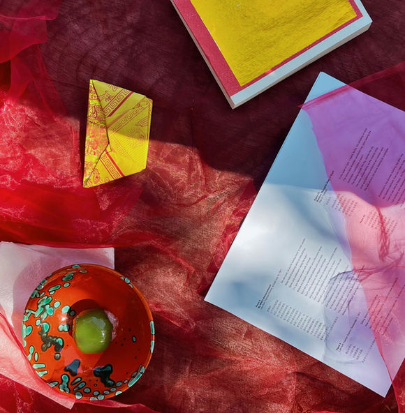 Mulberry paper, ink, window film, tracing paper, tulle, thread, wire, joss paper, spirit money, incense, qingtuan and chrysanthemums at the Angel of Grief, Stanford