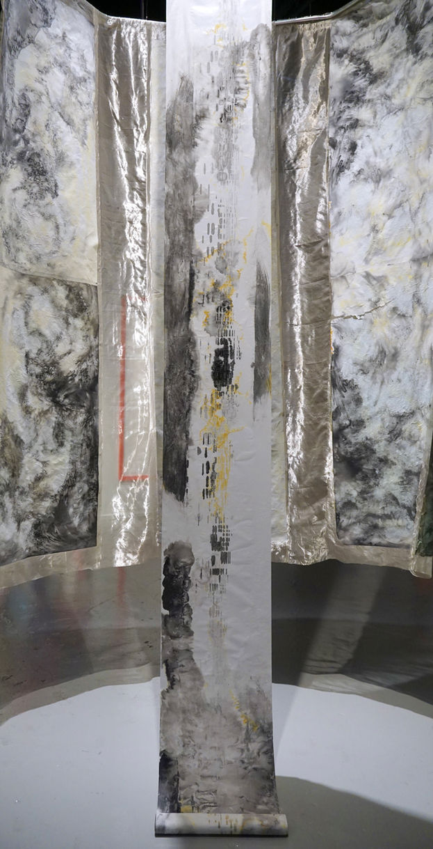 2025. Ink, iodine, lotus leaf, gardenia fruit and safflower on mulberry paper. Hanging scroll; 18 in x 82 ft